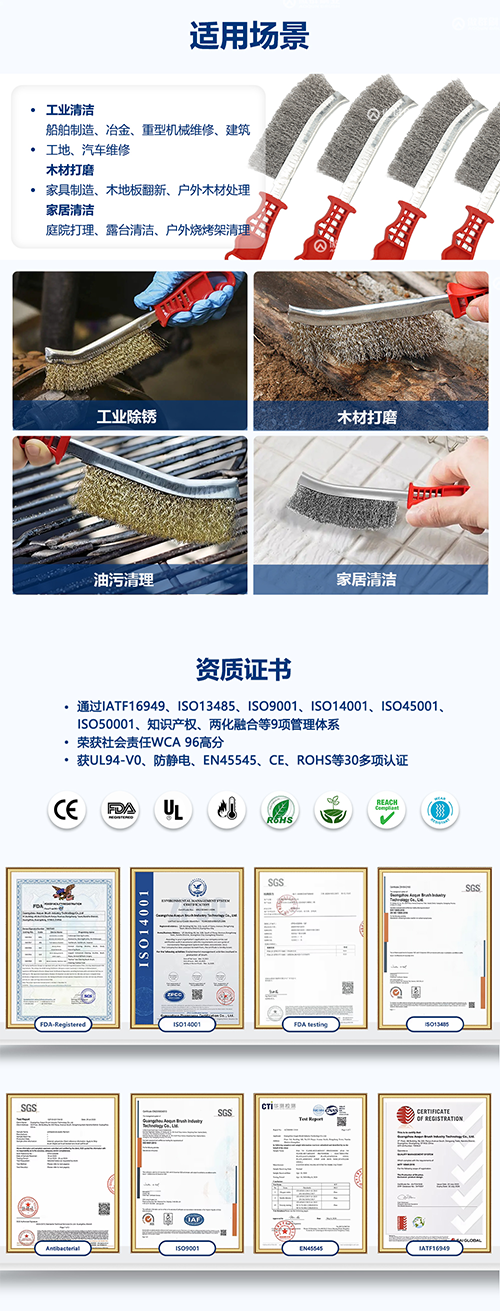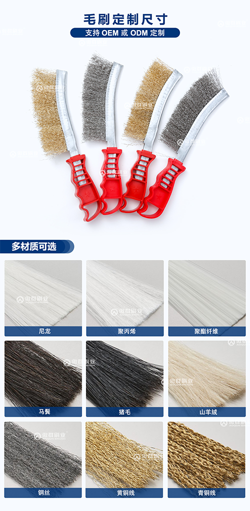 - 刷毛材質(zhì):多材質(zhì)可選:尼龍、聚丙烯、聚酯纖維、馬鬃、豬毛、山羊絨、鋼絲、黃銅線、青銅線